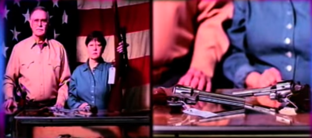 The “sacred store” is a gun shop: a man and woman standing in front of the U.S. flag with rifles and handguns laid out on the counter.