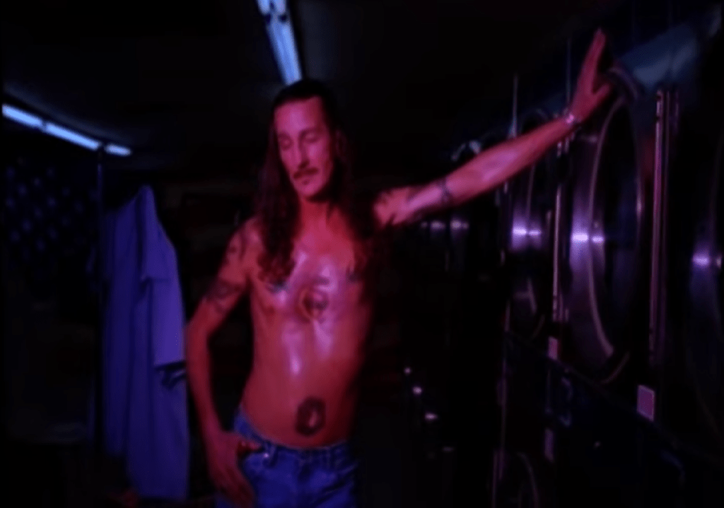 At 2:30, the scene shifts to a laundromat. A shirtless man leans on a row of industrial washers, with U.S. flags hanging in the background and there is a 13 under the circular door he is leaning on.