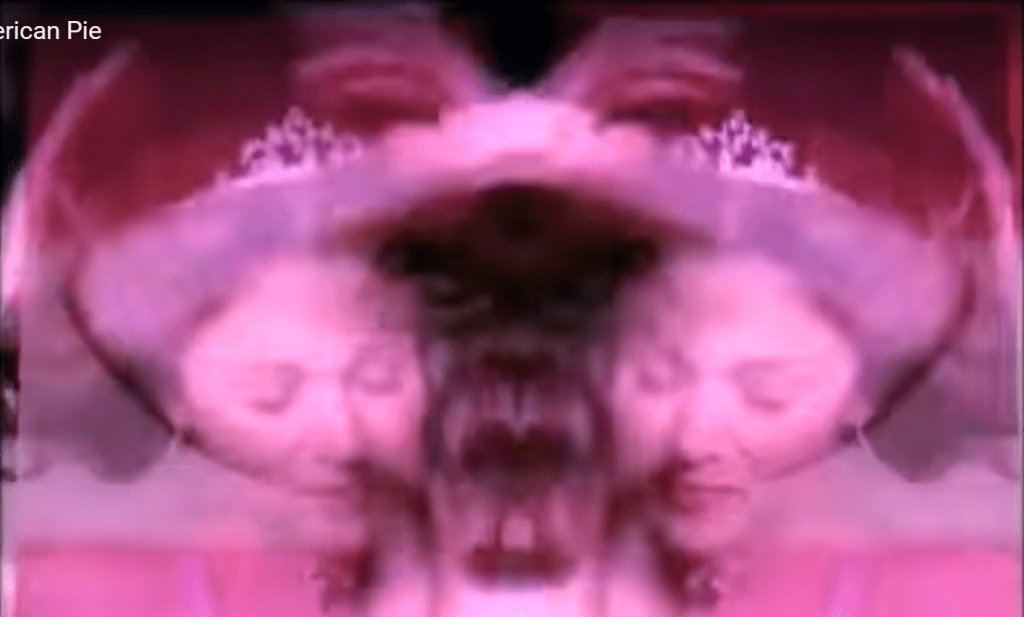 At 1:59 into the video, for a single frame in the original version, there is an image that looks like a demon emerging from between spread legs—like a birth. You need to slow the playback to 0.25x speed and tap play/pause around 1:58–1:59 to catch it. It forms and disappears very quickly, and in the newer version it’s not quite as well defined.