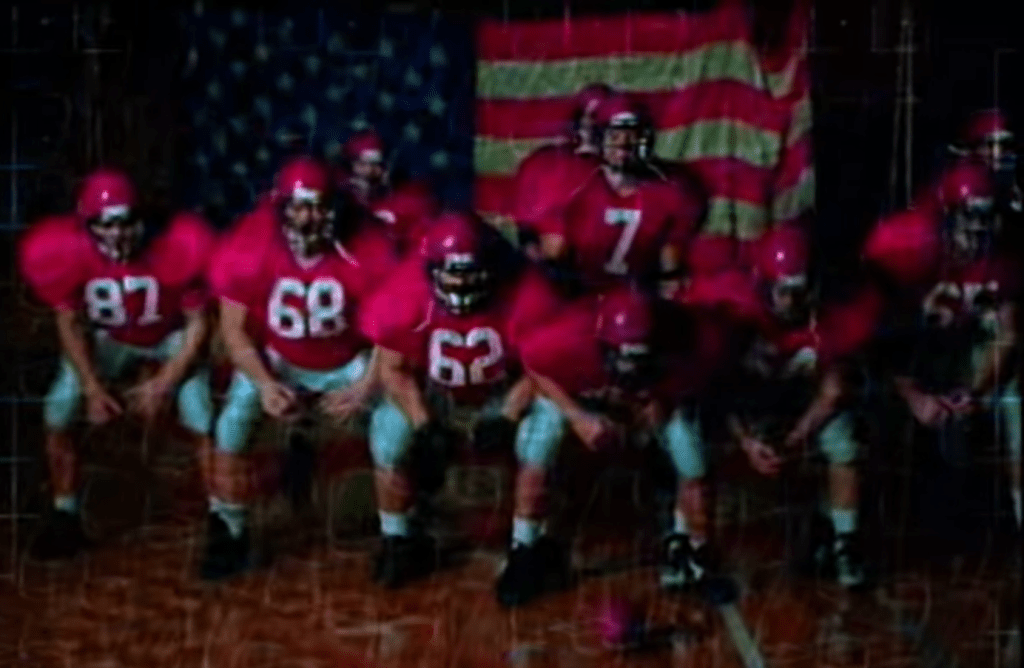 At 3:20, we see an American high school football team posed in front of the U.S. flag. The quarterback wearing number 7 leads, calling the plays.