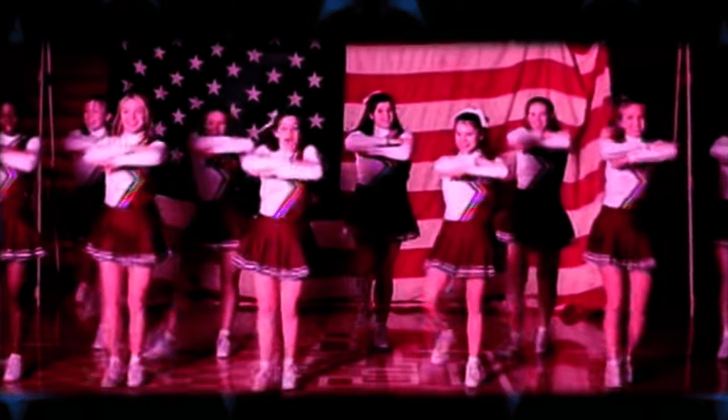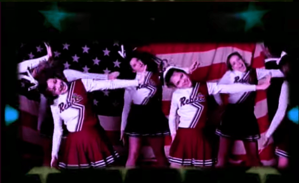 At 2:17, and earlier, they look like stereotypical American high school cheerleaders: energetic, smiling, and clearly framed by the American flag. Their uniforms say “Rebels.”